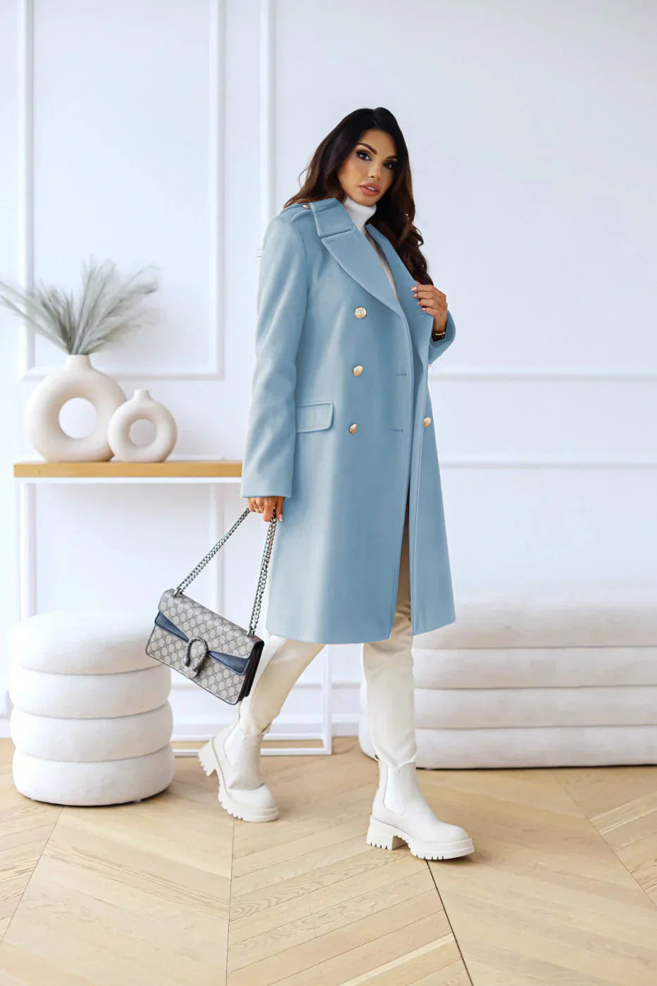 Bereichern Sie Ihre Garderobe mit diesem langen, doppelreihigen Damenmantel. Die klassische Doppelreiher-Front verleiht ihm einen eleganten und strukturierten Look und bietet gleichzeitig angenehmen Tragekomfort. Dank der längeren Form wärmt er und wirkt elegant – ideal für die kühleren Jahreszeiten. Dieser vielseitige und stilvolle Mantel eignet sich perfekt für den Arbeitsalltag, formelle Anlässe oder den Alltag und lässt sich mühelos mit Kleidern, Hosen oder Lagenlooks kombinieren.